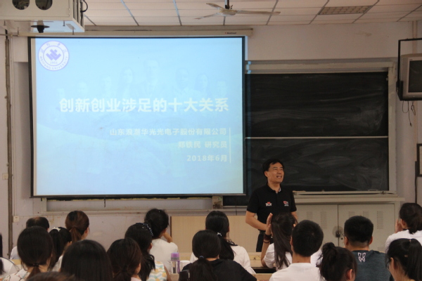 2018年6月22日下午四点,物理与光电工程学院特邀请山东浪潮华光光电子股份有限公司董事长郑铁民在明正楼5210室开展“创新创业涉足的十大关系”专题报告,物电学院院长李英德、副院长赵加强出席并主持了讲座。
