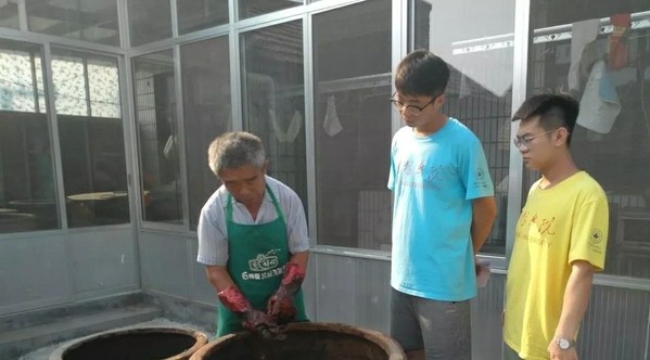 一走进酱菜厂,志愿者们便看见一位老大爷顶着炎炎烈日,围着满院子的酱缸不断走动和观察,这激起了志愿者们的好奇心,便想跟大爷来探个究竟。“大爷您好,我们是 暑期社会实践的大学生,来到柳山这几天,我们几乎顿顿饭都离不开独有风味的酱菜,所以就想知道普通的黄瓜、西瓜、萝卜、茄子是怎么制作成美味的酱菜的?”大爷了解到我们的来意后,便把我们领到腌制酱菜的缸前,缕缕酱香味扑鼻而来。大爷说到:“柳山盛产大豆,酱菜厂充分利用我们自己的原材料大豆,将大豆炒熟研磨,再纯手工制作成豆酱,而且我们的豆酱,只用大豆、盐、水、面粉这几种原材料,从来不放任何添加剂”虽然这种纯手工腌制酱菜的工序繁琐,但是原汁原味原生态,腌制出来的酱菜却是美味可口,让人欲罢不能的。