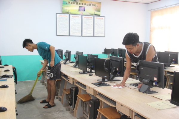 在学生离开后,志愿者队员收拾整理微机室桌椅器材。