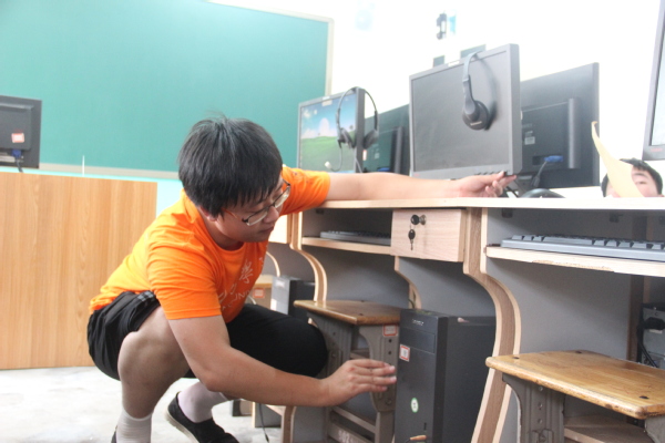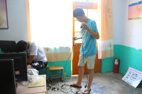 队员们为同学们安装对赠电脑,一台一台进行检查。