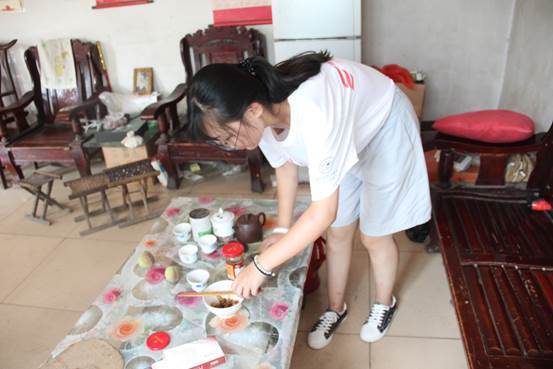 志愿者们在门口看见了乘凉的史大爷,见到志愿者们到来。史大爷欣喜的招呼着志愿者们进屋,“热不热,渴不渴啊”史大爷不断的询问着志愿者们的感受,一进屋连忙打开风扇,让志愿者们坐下休息。