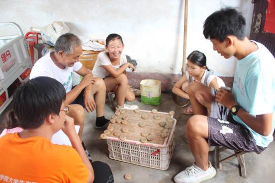 看着重新变整洁的屋子,志愿者们还“赖”着不走,孙路冲同学看到门口的象棋,便主动提出要与史大爷杀上几盘,“好啊,也让我见识一下你们的棋艺。”史大爷笑呵呵的的说到。几个会玩象棋的志愿者马上搭起了小木桌,摆上了棋子。在棋盘上,你来我往杀的好不热闹,双方横马跳卒,车攻炮轰,果真,姜还是老的辣,尽管几个志愿者一起商量着下,但在下棋时,也被史大爷逼的节节败退,一盘也没赢了史大爷。史大爷一会俯身和志愿者们专心的下棋,一会又抬头跟屋子里的人聊天,脸上总挂着开心的笑容。老人家的幸福就是这么简单:有人陪伴,有人帮手,有人话家常,就不会寂寞,就不会孤独。