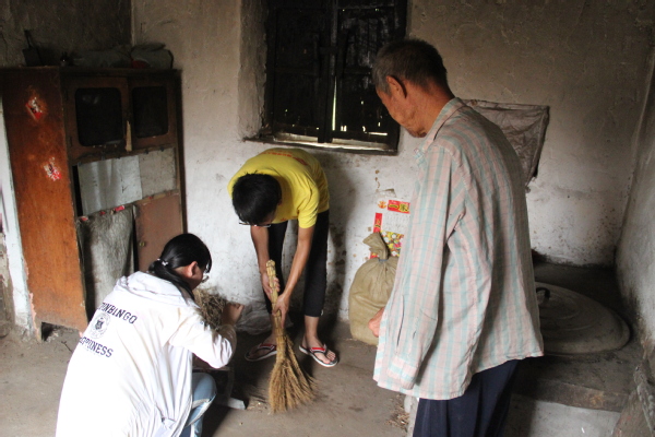 干净利落地收拾完碗筷后,志愿者们又打扫起了屋子,屋内仅有一个灶和地面上的木柴。说起这灶,它已经陪伴了谭大爷大半辈子,旁边的手动排风仿佛鼓动着整个家的希望,灶下熊熊烈火则供应着另一头寒冬中老人仅有的温存——土炕,而灶上的大锅则与孤单的老人形成了鲜明反差,志愿者们看在眼里疼在心里,再三对谭大爷强调:一定要注意室内用火安全,以免发生火灾!随后志愿者们和谭大爷聊起了家常,谭大爷说:“这些年,多亏了党和政府补助,才让我这个老汉子有机会活这么长久……”看着谭大爷说这句话时脸上挂满了幸福感、喜悦感,志愿者们也由衷感叹中国2020年全面脱贫工程的伟大,也树立起了对打好脱贫攻坚战的强烈信心。