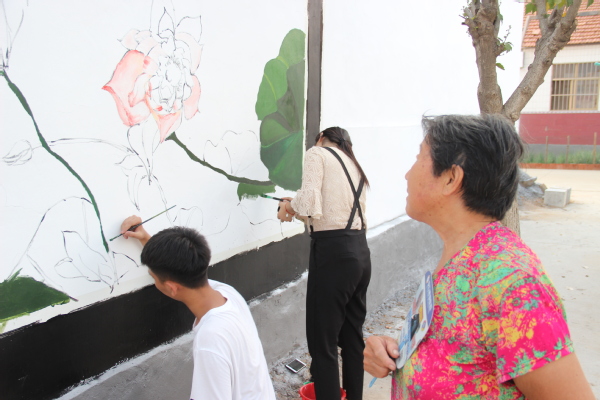 围观的村民时而定睛注目墙绘图案,时而阅读墙绘文字,时而讨论墙绘的内容。大家都在用自己的方式去理解墙绘的含义,服务队绘制之余,也不忘用平实的语言帮助村民答疑解惑,真正的将墙绘中所体现的“和谐·家园”主题引申到现实中去,进而达到文化育人的目的。