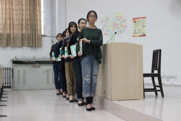 下午两点,礼仪队全体成员集合完毕,培训正式开始。部长刘庆悦和副部长李幸子就站姿,走姿,颁奖等动作作了详细讲解。站姿要保证脚成丁字步站立,前脚掌贴于后脚掌三分之二处,双手交叉放于身前,目视前方,表情自然。行走时,要求身体正直,步伐轻快平稳,步调整齐划一合乎标准。
