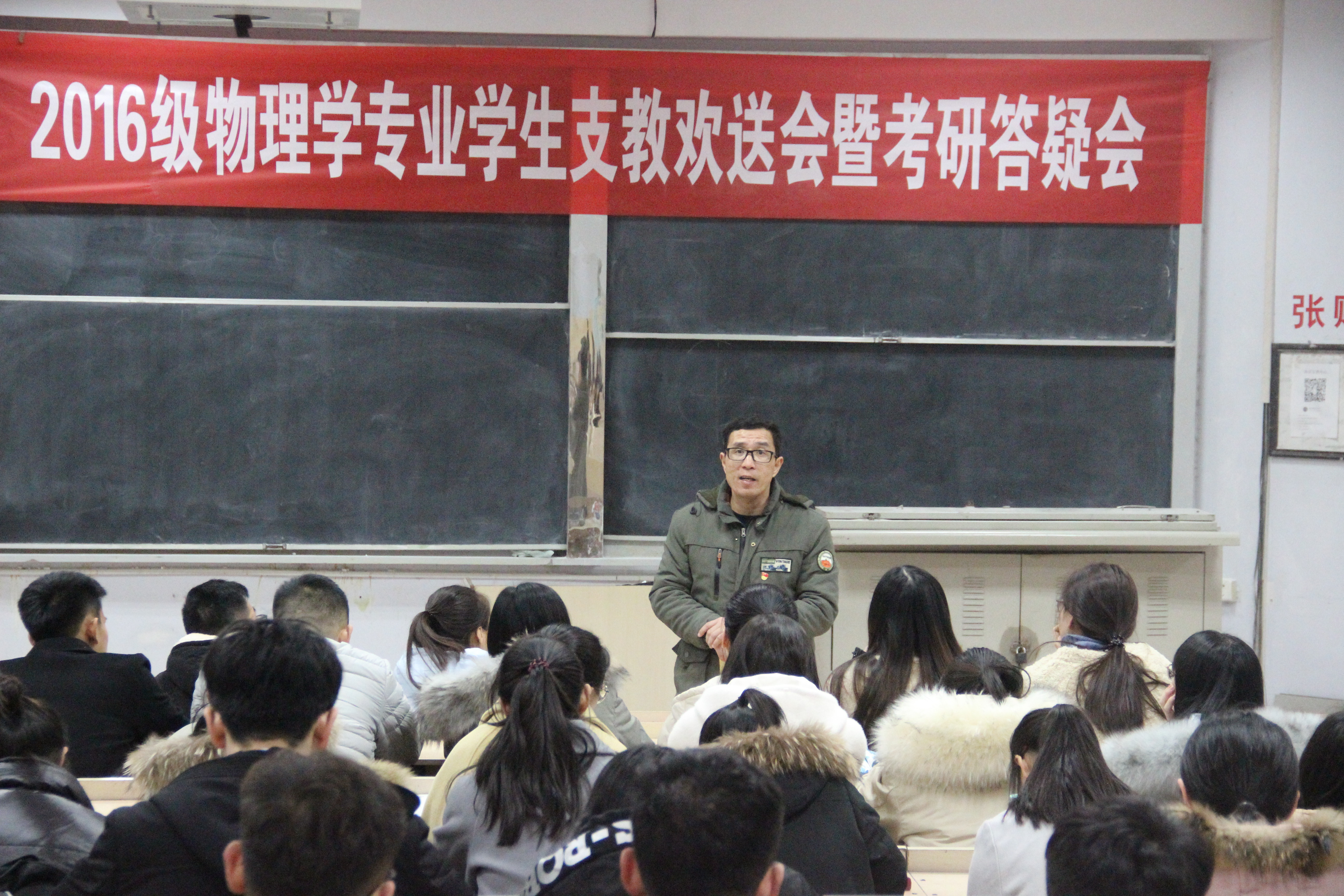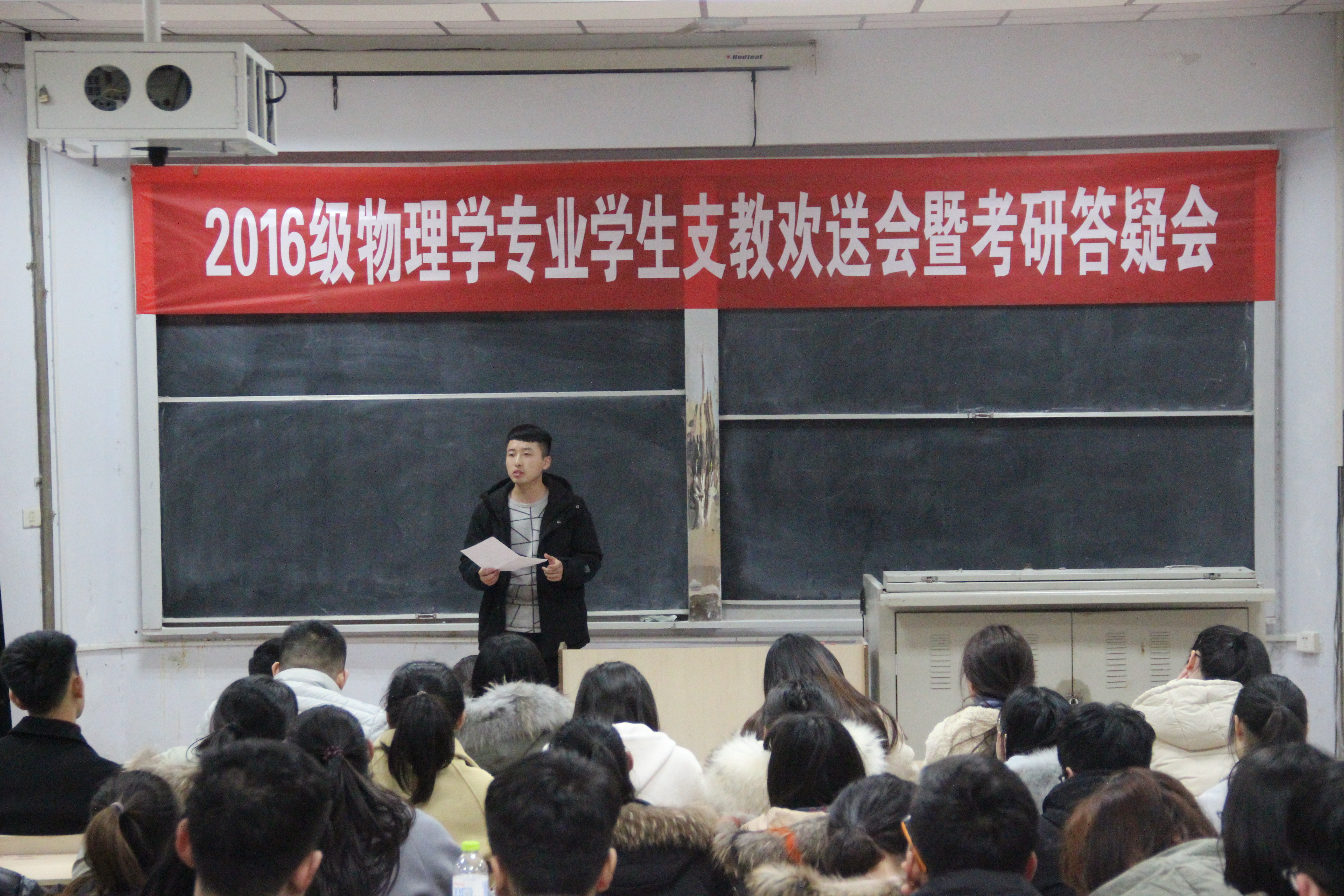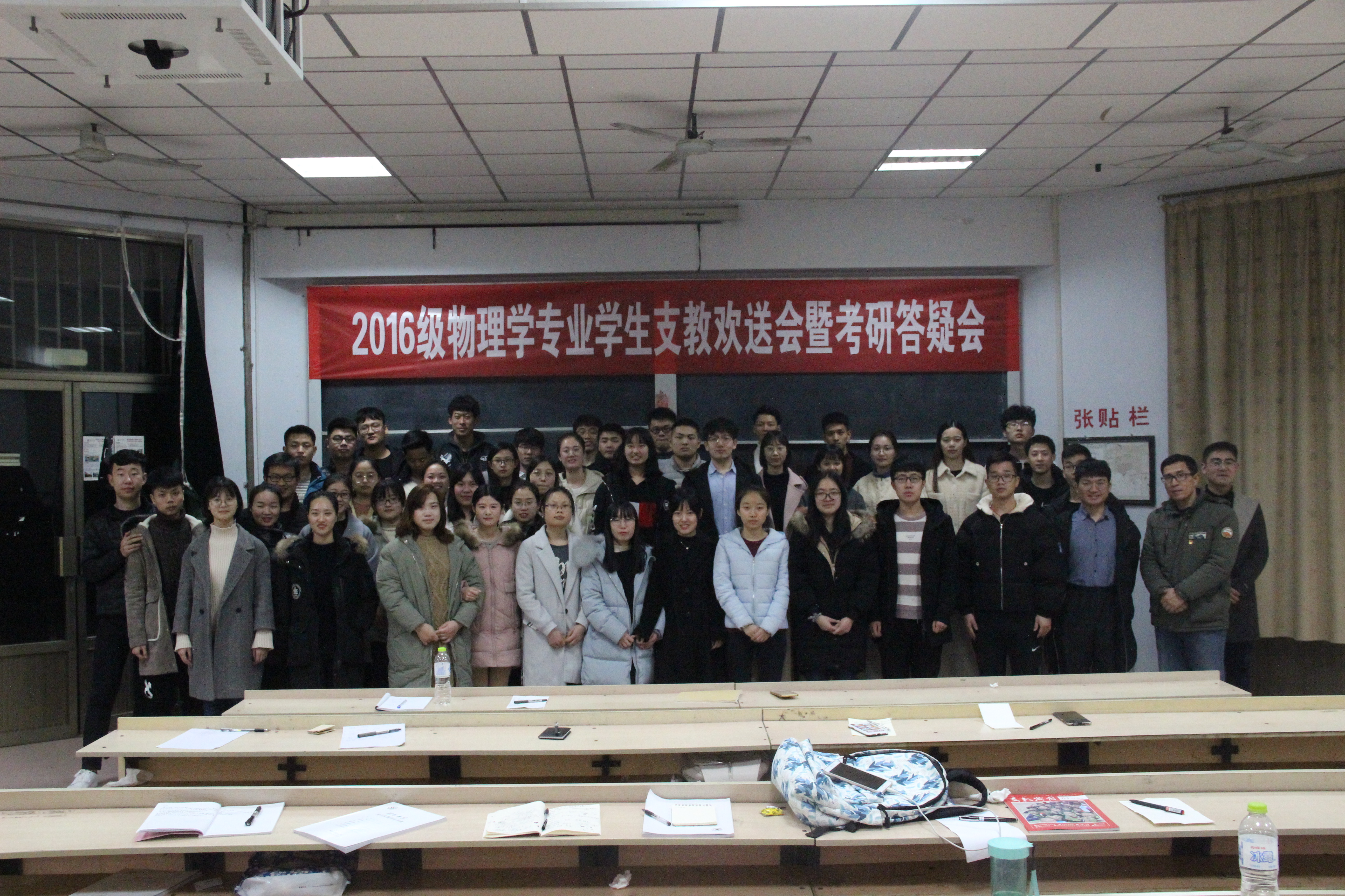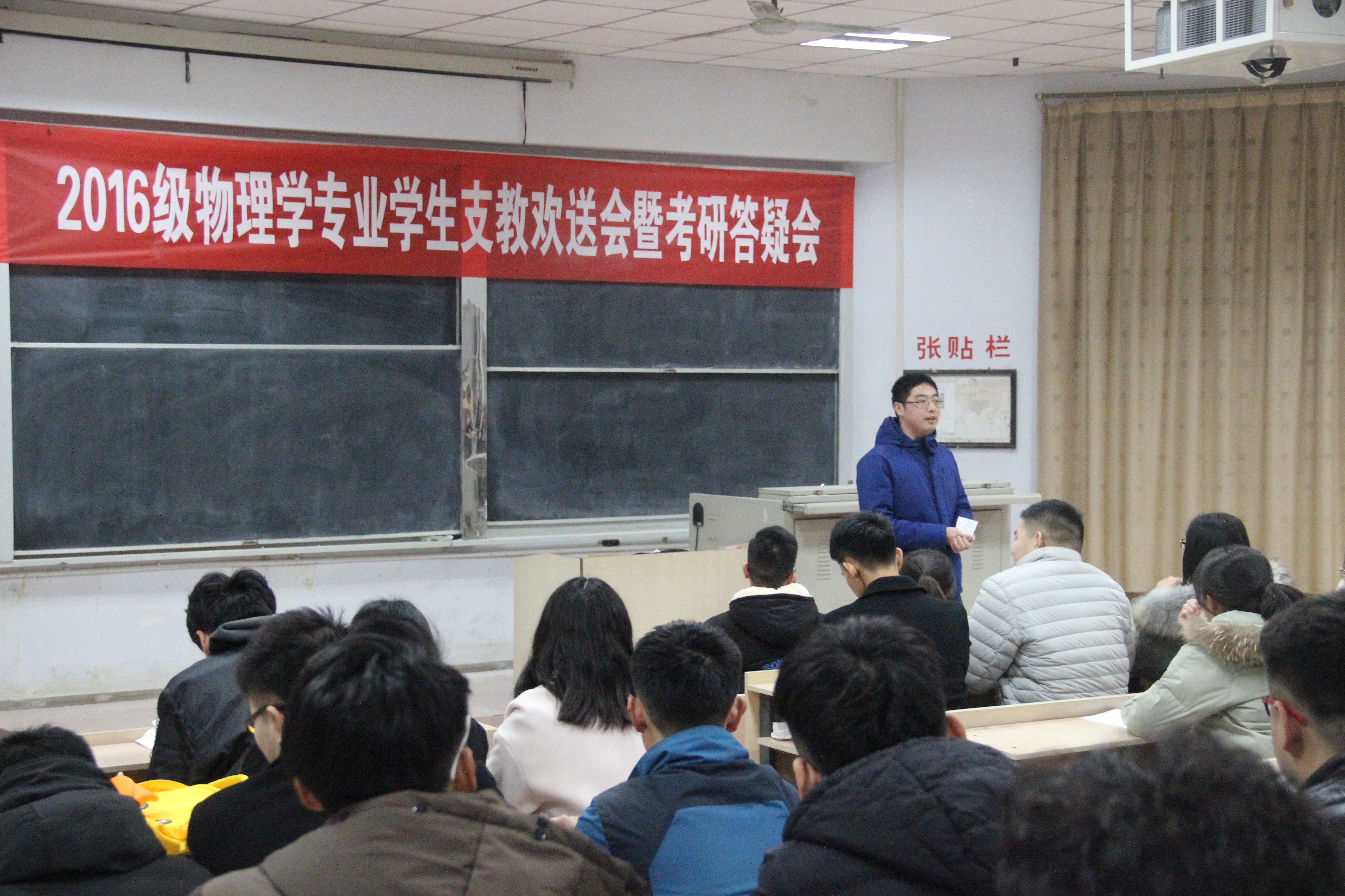 2019年2月25日晚18点,2016级物理学专业在物电学院明正楼5210室举办了2016级物理学专业学生支教欢送会暨考研答疑会,旨在助力该专业学生的支教与考研。参加人员有2016级辅导员金波昌、物电学院杨阳副教授、支教学生及其他有关学生。