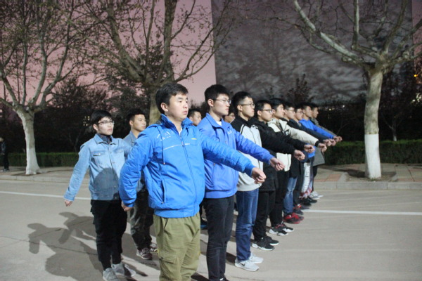 训练前期在国护队员的指导下主要进行姿势的规范化,训练后期进行道具的整齐度训练。在应用道具时,体育部部长向部分队员说明了拿气球的注意事项,并把小红旗发到队员手中。准备完毕后,伴随着训练员们充满激情的口号,方队成员开始了紧张有序的训练。训练初期,训练员们对齐步走的整齐度不是特别满意,但他们还是耐心的喊着口号并告诉方队人员改正的措施。每个队员都心怀感恩和为院争光之情,虽肩膀酸痛,也丝毫不敢懈怠。最终,队员们在训练员和主席团的悉心指导下,齐步走的整齐度在一定程度上得到了很大的提高。“一分耕耘,一分收获。”物理与光电工程学院的方队队员最终能团结一致的迈出整齐的步伐,喊出响亮的口号。