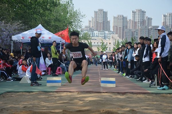 阳光普照大地,就连操场的细小角落也顾及的到。物理与光电工程学院的臧也与邓延硕两位运动健儿也在积极地做着赛前热身准备,一丝一毫的时间也不愿浪费。试跳、摆臂、深呼吸,一遍又一遍地重复着,只为最后的奋力的一跳。终于轮到物电学院上场了,首先登上赛场的是臧也,只见他神情自若,不急不缓的走到指定位置,如同久经沙场的战士,面对敌人的进击,临危不惧,从容应对。前期运动员摆臂、下蹲准备起跳,在寂静的长空中划出一道道完美的弧线,最后稳稳地落在了沙坑中,留下了写满汗水的脚印。臧也与邓延硕都在跳远的光荣榜上留下佳绩,同时,此起彼伏的掌声与喝彩声更是给予了运动员莫大的肯定。