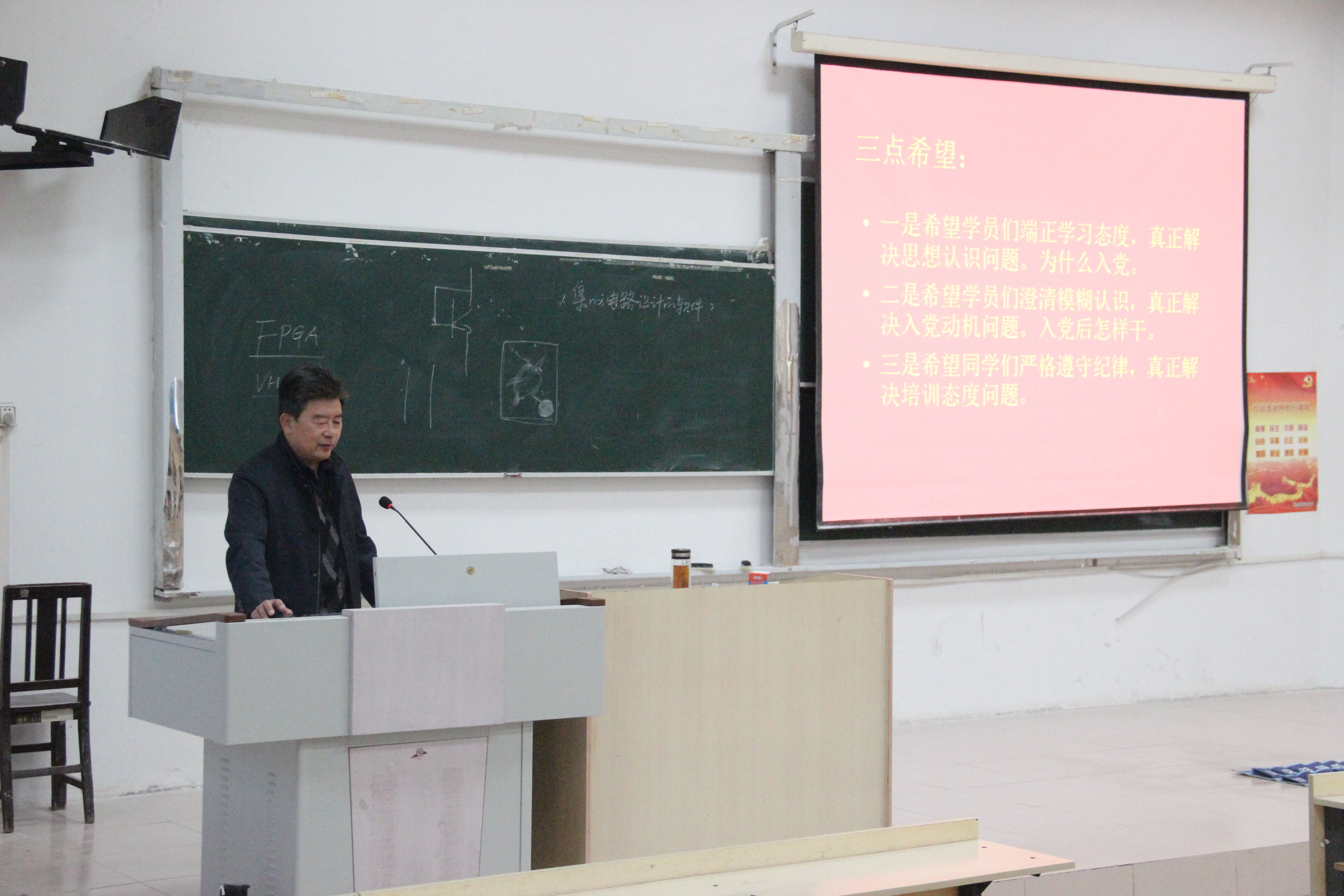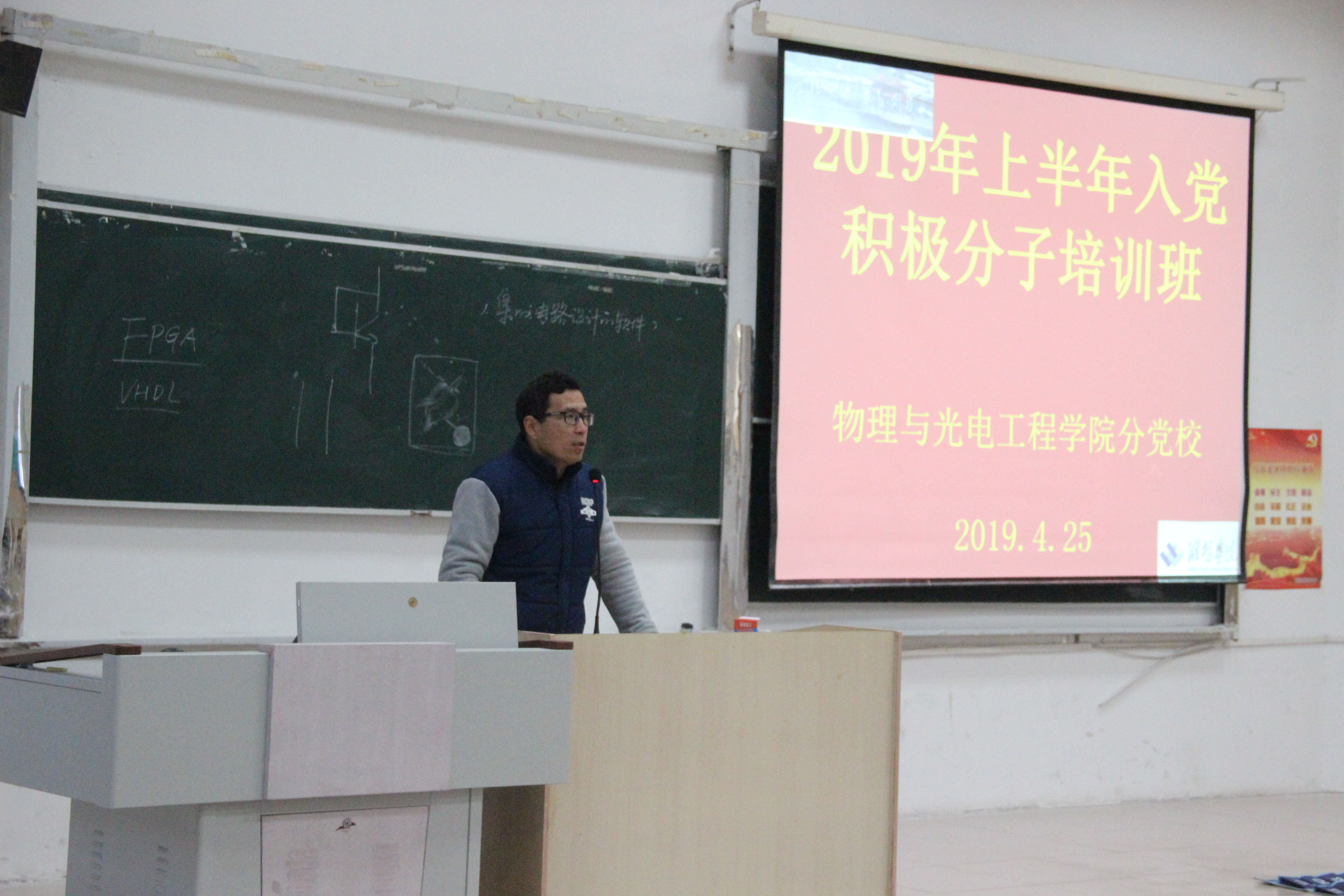 为加强对新一期入党积极分子的教育培训,奠定发展学生党员工作基础,2819年4月25日下午4时,物理与光电工程学院在明正楼5109教室举行了2019年上学期入党积极分子培训班开班仪式并授课,物电学院副科级组织员金波昌主持,党总支书记仲明礼主讲了第一课,2019年上学期在校入党积极分子参加此次培训。