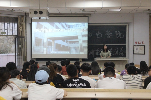 为加大力度搞好榜样示范引领活动,2019年5月24日晚,物理与光电工程学院在5210教室举办物理学专业考研经验交流会。交流会由杨阳老师主持,学院学生会学习部组织,特邀王永奎,王元元,聂深双等16名15级物理学考研同学讲解关于考研科目复习、择校择专业、时间规划、心态调整等方面的经验,16、17、18级部分同学参加。