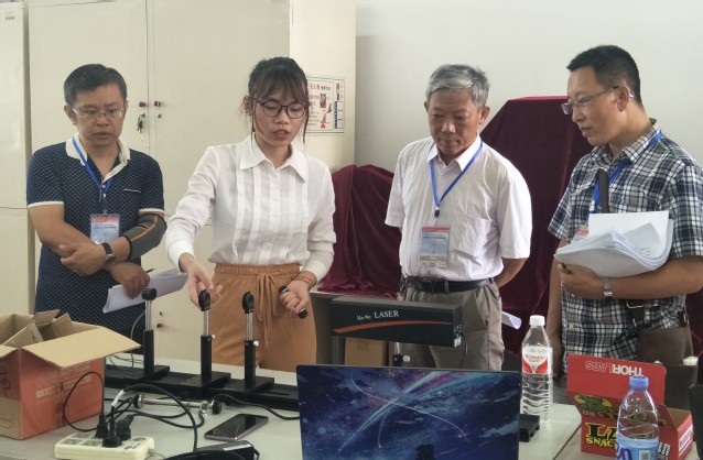 本次大赛共分为5组,分别在5个实验室进行比赛。参赛选手们选题广泛、视角广阔,其中有利用近红外光谱分析西瓜可溶性固形物的含量,有红绿灯识别与播报系统,有测量棱镜材料的折射率及色散等创新实验装置。评委们就其项目可行性、科学性、专业性、现实意义等方面进行分析和提问,指出其不足之处并提出修改建议。