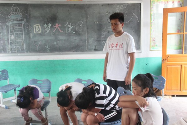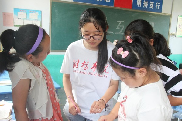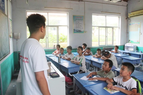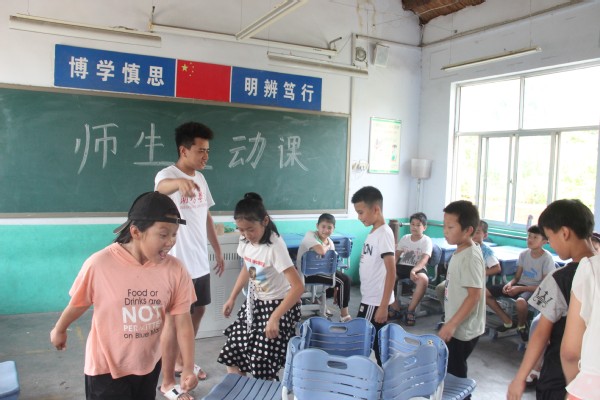 中国青年网潍坊7月27日电(通讯员 王守博)“圆梦教育”社会实践服务队连续八年扎根于茹家庄小学开展支教活动。,茹家庄小学位于山东省潍坊市临朐县五井镇西南, 因四面环山、交通不畅,教育、教学基础相对薄弱。为了响应国务院号召,关爱留守儿童,志愿者们在此设立“七彩课堂”,获得孩子们的一致好评。2019年7月27日,志愿者们通过游戏课堂的方式,再次用实际行动关爱留守儿童,呵护他们健康成长。