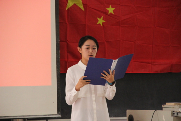 活动伊始,全体人员怀着庄严肃穆的心情面向五星红旗奏唱国歌,声音洪亮、感情真挚饱满。国歌声回荡在5210教室,久久不息。演讲环节,同学们讲述的侧重点不同,讲述的风格不同,但都表达出了自己对祖国的美好祝愿。张淑娴同学的演讲可谓别具一格。她以“五千载峥嵘厚重,七十年瑞意新光”为主题,从中华民族优秀的历史讲起,结合近代屈辱的历史以及中国共产党带领人民站起来、富起来、强起来的奋斗历史,赞扬了党带领人民取得的辉煌成就。最后她希望同学们趁时代正好,为自己的梦想奋斗,为中国梦贡献自己的力量。