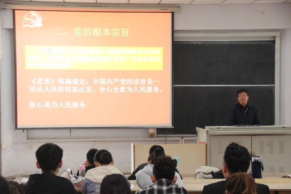 培训会伊始,仲书记首先以课前思考这一有趣的方式引出了政党的含义,接着通过PPT带领同学们回顾了党的光辉历史,向大家介绍了党的性质、党的宗旨以及党的指导思想等知识。仲书记提到了两个先锋队的成立与意义,运用毛泽东等伟大领袖的名言强调了“为人民服务”的重要性,并将入党与入工会作了比较,让同学们牢记入党就意味着思想上要转变,要将“全心全意为人民服务”铭记于心。本次报告会内容紧凑连贯,内涵不断深化,仲书记用大量的典型事例,向同学们进行了详细地讲述,吸引了同学们的兴趣,大家都抬起头来认真倾听,时不时在笔记本上写下自己的感悟。