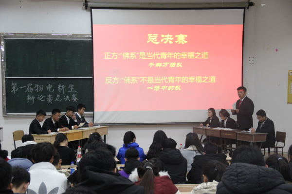 为提高2019级学生的辩证分析能力与语言表达能力,锻炼逻辑思维,丰富同学们的业余生活,开阔同学们的视野,2019年11月27日晚,物理与光程学院于知新楼4109教室举行第一届物电新生辩论赛总决赛。物电学院19级辅导员安然,大学生争鸣社成员黎梦曦、王庆、张潇文以及物电学院第十九届学生会主席团成员出席活动担任评委,19级部分同学作为观众参加本次辩论赛。